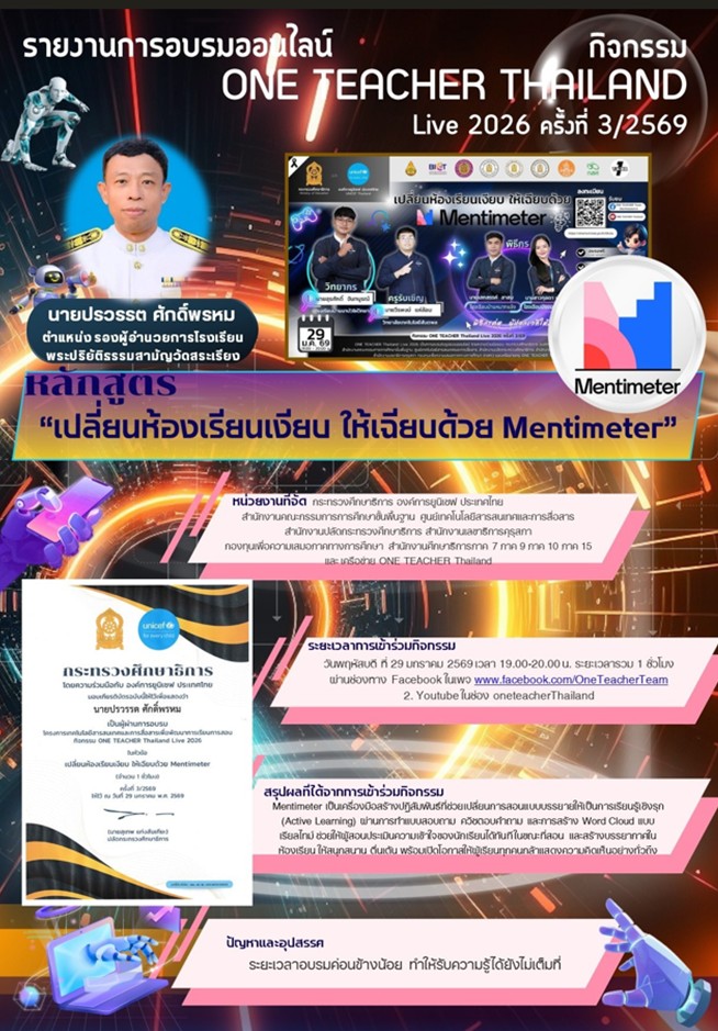 ชื่อผลงาน : เกียรติบัตรผ่านการอบรม ONE TEACHER Thailand ในหัวข้อ "เปลี่ยนห้องเรียนเงียบ ให้เฉียบด้วย Mentimeter" ครั้งที่ 3/2569