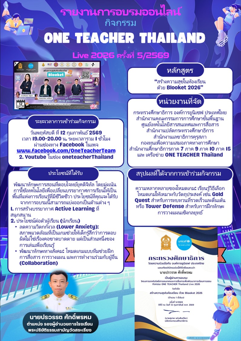 ชื่อผลงาน : เกียรติบัตรผ่านการอบรม ONE TEACHER Thailand ในหัวข้อ "สร้างความสุขในห้องเรียน ด้วย Blooket 2026" ครั้งที่ 5/2569